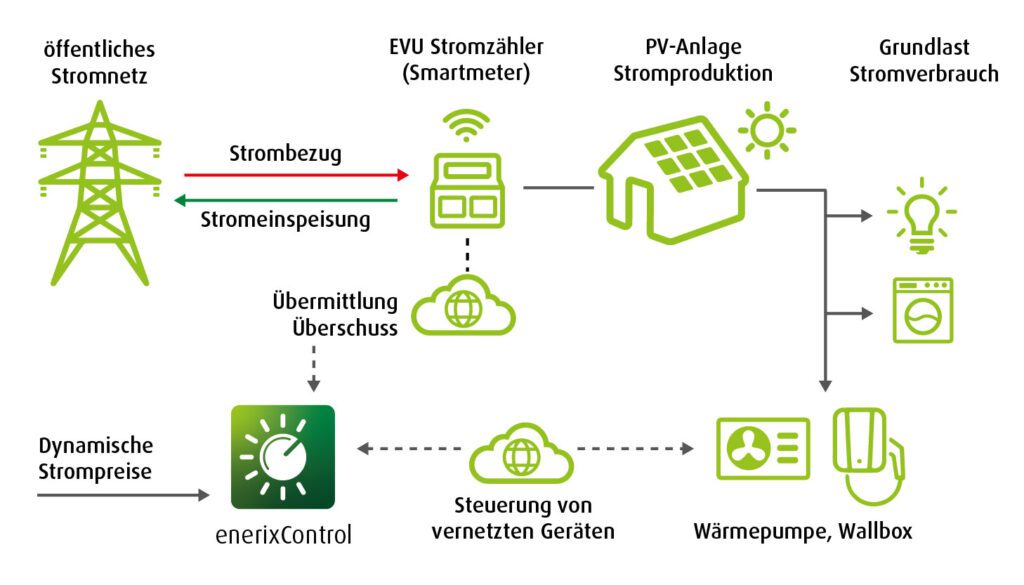 Startseite • Energiemanagement Energiemanagement Solarstrom maximal selbst nutzen! Mit dem enerixControl Energiemanager vernetzt du dein Solarkraftwerk intelligent mit all deinen Verbrauchern im Haus – ob Wärmepumpe, Wallbox oder andere Geräte. So stellst du sicher, dass der Energiefluss stets optimal ist und du das Maximum aus deiner PV-Anlage herausholst. Jetzt für Android herunterladen Alles im Blick Mit dem detaillierten Monitoring hast du jederzeit den Überblick über den Energiefluss in deinem Haus Eigenverbrauch optimieren Der Betrieb deiner Verbraucher, wie z.B. deiner Wallbox, wird automatisch optimiert. Smart priorisieren Du gibst vor, welche Verbraucher dir am wichtigsten sind, der enerixControl optimiert die Schaltreihenfolge. Ohne extra Hardware Der enerixControl Energiemanager kommt ganz ohne zusätzliche Hardware aus. Entdecke die Zukunft des Energiemanagements mit dem enerixControl! Wenn du eine Photovoltaikanlage betreibst, möchtest du natürlich so viel wie möglich von deinem günstigen Solarstrom nutzen und nur im Notfall teuren Netzstrom beziehen. Genau hier kommt unser enerixControl ins Spiel – dein Energiemanager – der dir hilft, deine Energiekosten nachhaltig zu senken. Mit dem enerixControl vernetzt du dein Solarkraftwerk intelligent mit all deinen Verbrauchern im Haus – ob Wärmepumpe, Wallbox oder andere Geräte. So stellst du sicher, dass der Energiefluss stets optimal ist und du das Maximum aus deiner PV-Anlage herausholst. Ideales Zusammenspiel von Produktion, Verbrauch und Netzbezug E-Auto Mit den verschiedenen Ladefunktionen kannst du den Ladevorgang deines E-Autos ganz nach deinen Bedürfnissen steuern, z.B Schnellladen im Boost-Modus, vorausschauend per Ladeplan oder kostenoptimiert nach Strompreis. Wärmepumpe Ist genügend Sonnenstrom verfügbar, sorgt enerixControl dafür, dass deine Wärmepumpe warmes Wasser für den Pufferspeicher produziert.1 Heizstab Wer überschüssigen Solarstrom besitzt, kann diesen dank enerixControl einfach nutzen, um Warmwasser zu produzieren.1 Oft ist der Ertrag aus der Sommer- und Übergangszeit ausreichend, um sich unabhängig von fossilen Energieträgern zu machen. 1evtl. zusätzliche Hardware erforderlich Durchschnittliche Einsparung pro Jahr mit enerixControl Dynamische Stromtarife ⌀ 358€ Einsparung durch erhöhten Eigenverbrauch durch das PV-Überschussmanagement von enerixControl ⌀ 222€ Einsparung durch Verlagerung des Verbrauchs in günstige Zeiten durch enerixControl, Optimierung auf dynamischen Tarif = ⌀ 580€ Anonymisierte Analyse von 4768 Usern über einen Zeitraum von 170.000 Tagen: Durchschnittlicher 7300kWh, durchschnittliche installierte PV-Leistung 7,9kW und durchschnittliche Kapazität des Heimspeichers 4,2kWh. Vergleichswerte der Hochschule für Technik und Wirtschaft Berlin für ein Eigenheim mit diesen Werten. 48% Autarkie. Berechnet mit einem Stromtarif von 35cd/kWh und einer Einspeisevergütung von 8ct/kWh. Persönliche und individuelle Beratung vom Fachberater aus deiner Nähe Erlebe, wie einfach und effizient die Steuerung deiner Energieflüsse sein kann! Mit enerixControl optimierst du deinen Eigenverbrauch und reduzierst deine Energiekosten. Dein Weg zur nachhaltigen Energiezukunft: Eigenverbrauch steigern: Nutze deinen Solarstrom maximal selbst. Gerätesteuerung: Integriere Wärmepumpe, Wallbox und mehr. E-Auto laden: Überschussladen leicht gemacht. Dynamische Tarife einbinden: Profitiere von günstigen Strompreisen. Egal, ob du deine Energiekosten reduzieren oder einen Beitrag zur Energiewende leisten möchtest – enerixControl ist dein verlässlicher Partner. Fülle einfach das Kontaktformular aus, und unser Fachberater in deiner Nähe freut sich darauf, dich persönlich und individuell zu beraten. Gemeinsam finden wir die optimale Lösung, um deine Nachhaltigkeitsziele zu erreichen. Jetzt Formular ausfüllen und profitieren Erfahre mehr zum Thema EMS Das könnte dich auch interessieren Kühlen mit der Wärmepumpe: Der komplette Leitfaden für 2025 Solaranlage online planen mit enerixPilot Finde heraus, wie viel du mit einer Solaranlage sparen kannst – schnell und einfach. Gib deine Verbrauchs-Daten ein und sieh in wenigen Klicks deine Einsparungen. Florian Schmitz 21/07/2025・13 Min Lesezeit Photovoltaik Nordseite: Wie viel Strom produziert sie wirklich? Ein kompletter Leitfaden Lange Zeit galt die Regel als in Stein gemeißelt: Eine Photovoltaikanlage gehört auf die Südseite, Punkt. Dächer mit Nordausrichtung wurden als ungeeignet und unwirtschaftlich abgetan. Doch die Zeiten und die Florian Schmitz 21/07/2025・6 Min Lesezeit Europas Beste – Enerix gehört zu den Top 1% Solaranbietern in Deutschland und Österreich Bonn/Regensburg. Enerix, gehört zu den Top 1 % im Bereich der dezentralen Stromerzeugung in Deutschland und Österreich. Das Unternehmen aus Regensburg wurde auf Basis der europaweiten Analyse von 15.000 Installateuren Lucas Flügel 06/11/2024・2 Min Lesezeit Brände bei Solarspeichern: Wie sicher ist Sonnenstrom wirklich? Feuer und Flamme – wortwörtlich, wenn es um Stromspeicher geht. Bist du unsicher, wie sicher dein PV-Speicher ist? Hier bekommst du alle wichtigen Infos auf einen Blick. In den letzten Lucas Flügel 21/08/2024・7 Min Lesezeit Energiewende Politik Solarpflicht in Deutschland: Diese Bundesländer wollen den Solarertrag steigern Verschiedene Bundesländer in Deutschland führen Solarpflichten ein, um den Ausbau der Photovoltaik zu fördern. Erfahre, wo du bald eine Solaranlage installieren musst und welche Ausnahmen es gibt. Peter Knuth 01/08/2024・5 Min Lesezeit