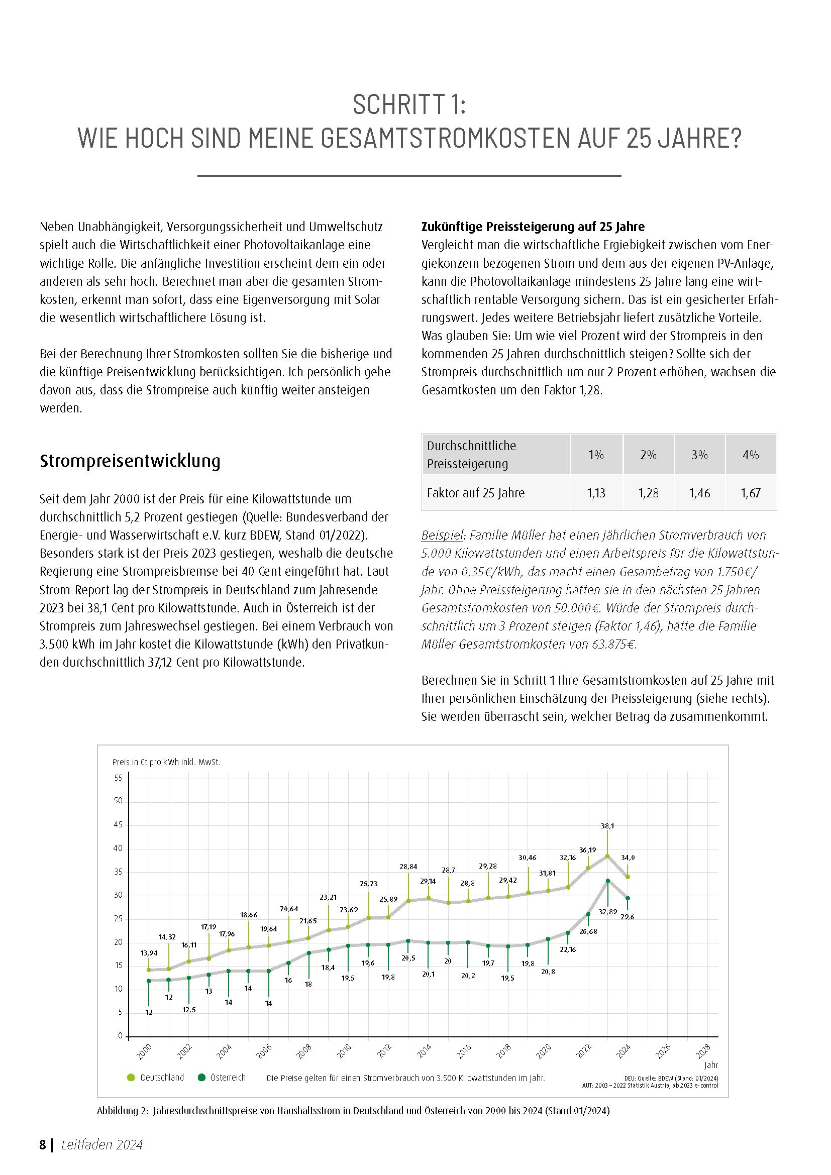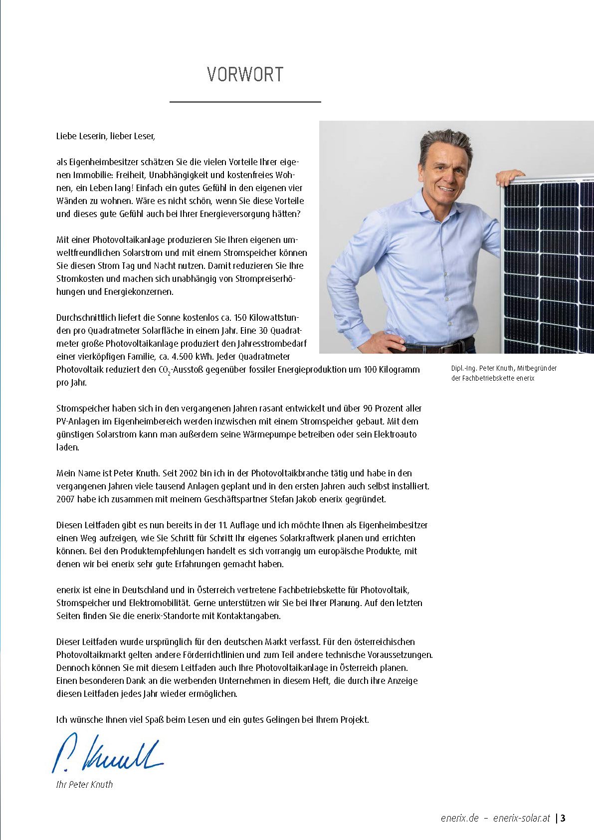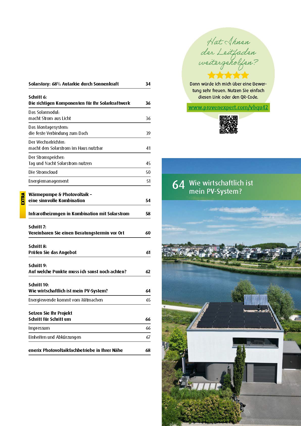 Startseite • Photovoltaik Leitfaden Schritt für Schritt zur eigenen Photovoltaikanlage Dieser Leitfaden enthält umfassendes Wissen aus mehr als 20 Jahren Branchenerfahrung und über 50.000 installierten Solaranlagen. Folgende Medien haben über den Photovoltaik-Leitfaden berichtet Schritt für Schritt zureigenen Photovoltaikanlage “Der enerix Photovoltaikleitfaden ist dein Schlüssel zur erfolgreichen Nutzung von Solarenergie. Er bietet dir detaillierte Anleitungen und wertvolle Tipps, die dir als Anfänger oder erfahrener Installateur den Weg ebnen. Mit diesem Leitfaden wird die komplexe Welt der Photovoltaik für dich verständlich und zugänglich. Nutze das Wissen unserer Experten, um deine eigene nachhaltige Energiezukunft zu gestalten.” Dipl.-Ing. Peter Knuth, Mitbegründer von eneix Darum ist der PV-Leitfaden ein Muss für Dich! Unverzichtbare Hilfe Erfahre vor dem Kauf einer PV-Anlage was wichtig im Entscheidungsprozess ist und um bares Geld zu sparen. Umfangreiches Wissen Über 70 Seiten, prall gefüllt mit allem, was du für den Übergang zu erneuerbaren Energien wissen musst Tiefgreifende Eingriffe Erhalte detaillierte Informationen und ehrliche Aufklärung für die korrekte Planung deiner Photovoltaikanlage. Statt €9.50, absolut kostenfrei Wir liefern dir unseren beliebten Ratgeber im Wert von 9,50 Euro inkl. Porto für 0€ nach Hause. Einfach deine Lieferadresse eingeben und in wenigen Tagen findest du dein gratis Exemplar im Briefkasten. Optional senden wir ihn dir auch als PDF per Mail zu. Wie dürfen wir dir dein Solarhandbuch zukommen lassen?? Kostenfrei als PDF oder gedruckt per Post bestellen Wirf einen Blick in unseren umfassenden Leitfaden Leserstimmen zum Photovoltaik Leitfaden „Es fühlt sich gut an, seinen eigenen Solar-Strom zu produzieren, so unabhängiger von der Strompreisentwicklung zu sein und etwas zur Verbesserung des eigenen ökologischen Fußabdrucks zu tun. Mit dem Photovoltaik-Leitfaden habe ich einen super Einstieg in das Thema bekommen und die Mitarbeiter von enerix Südschwarzwald haben mich bestens beraten. Die Entscheidung für die PV-Anlage wurde mir damit leicht gemacht…“ Tilman Galler aus Waldshut-Tiengen „Der Photovoltaik Leitfaden ist sowohl für den Einsteiger als auch für den informierten Laien sehr gut. Er bildet alle Belange rund ums Thema sehr transparent ab. Habe so eine komprimierte und verständliche Ausarbeitung noch nicht vorher gesehen. Vielen Dank und weiter so!” N. Scholz „Sehr geehrter Herr Knuth, schon viele Jahre bin ich am PV Markt beruflich tätig. Doch Ihr Photovoltaik Leitfaden und Ihr Service ist für mich nachhaltig beeindruckend. Einfach genial. Und dies alles kostenlos. Herzlichen Glückwunsch und viel viel Erfolg. Schöne Grüße aus Schonungen.” Uwe Gilbert Werthmann. „Übersichtlicher und gut strukturierter Photovoltaik Leitfaden, der Interessenten zur Nutzung von Solarstrom motiviert aber keine falschen Versprechungen macht. Sehr gut!” Joachim Laschinski Plane deine Energiezukunft jetzt – wir zeigen dir den Weg Ganz in Ruhe und direkt bei dir Zuhause. Photovoltaikleitfaden gratis anfordern